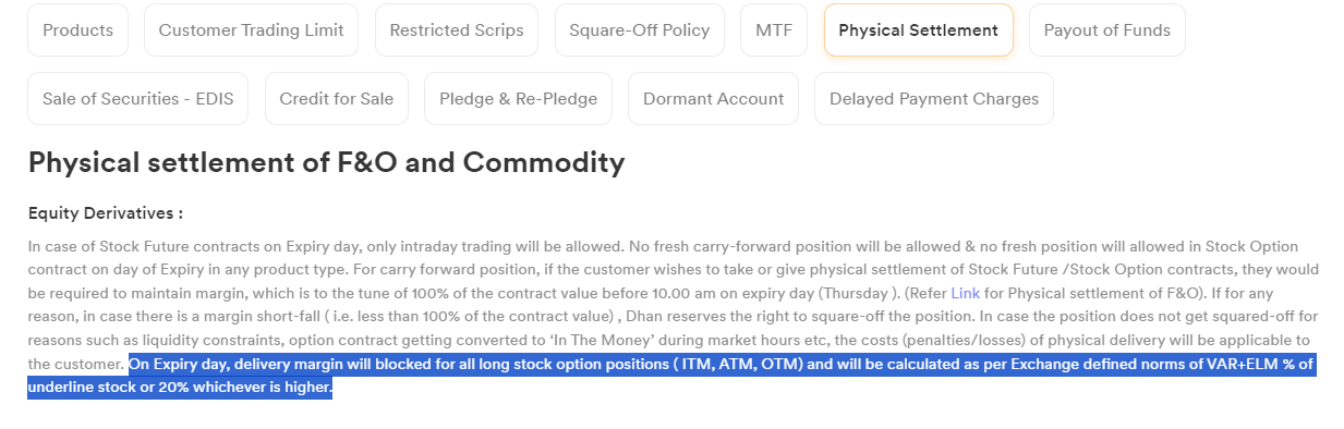 We have mentioned about the margin in our Risk policy : On Expiry day, delivery margin will blocked for all long stock option positions ( ITM, ATM, OTM) and will be calculated as per Exchange defined norms of VAR+ELM % of underline stock or 20% whichever is higher.