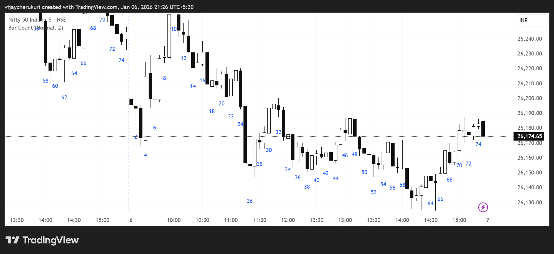 Can you please share a specific use case for this indicator? Based on our understanding, the bar count in a 5 minute chart will always be 74 bars from 9:15 to 3:30. The existing time scale already provides this information clearly, for example, the 10:00 am candle represents the 10th bar on a 5 minute timeframe. This is sufficient for most users.