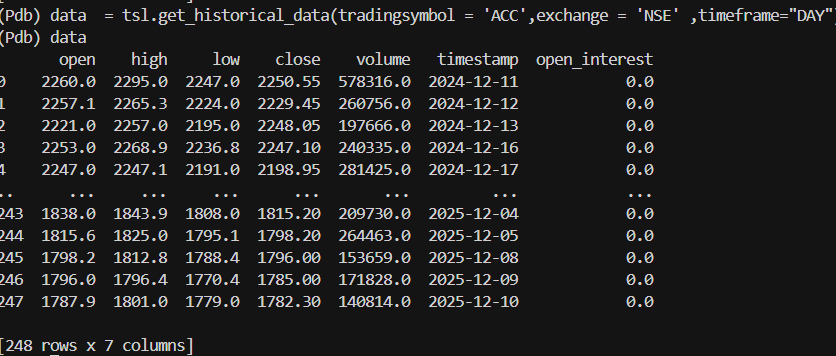 data = tsl.get_historical_data("NIFTY 100", "NSE", timeframe="1", sector="YES")