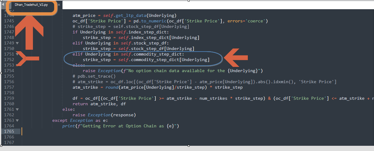 Hello @Tradehull_Imran , I am using Dhan_Tradehull_V2.py not Dhan_Tradehull.py, I checked in the Dhan_Tradehull_V2,py file and placed the code you said just before (elif Underlying in self.commodity_step_dict: strike_step = self.commodity_step_dict[Underlying] ) else statement but still showing the same error.