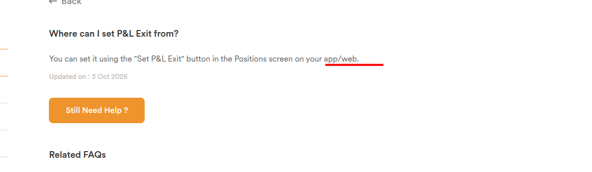 Yesterday, Dhan app update logs indicated that the Set P/L exit, but there is no information provided on how to set it. Additionally, the information cannot be found within the app.