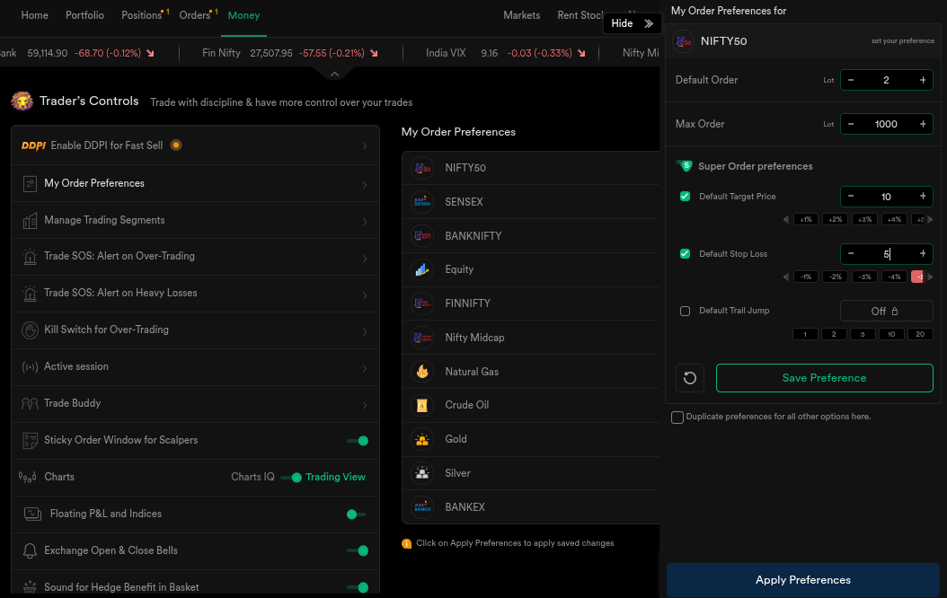 Through Trader Controls, you can preset target and stop-loss values for Super Orders. For major indices, commodities you can also preset the number of lots, and for equity orders, you can set default target and stop-loss values as well. Once configured, these values are automatically applied as soon as the order is placed, enabling a near one-click execution flow.