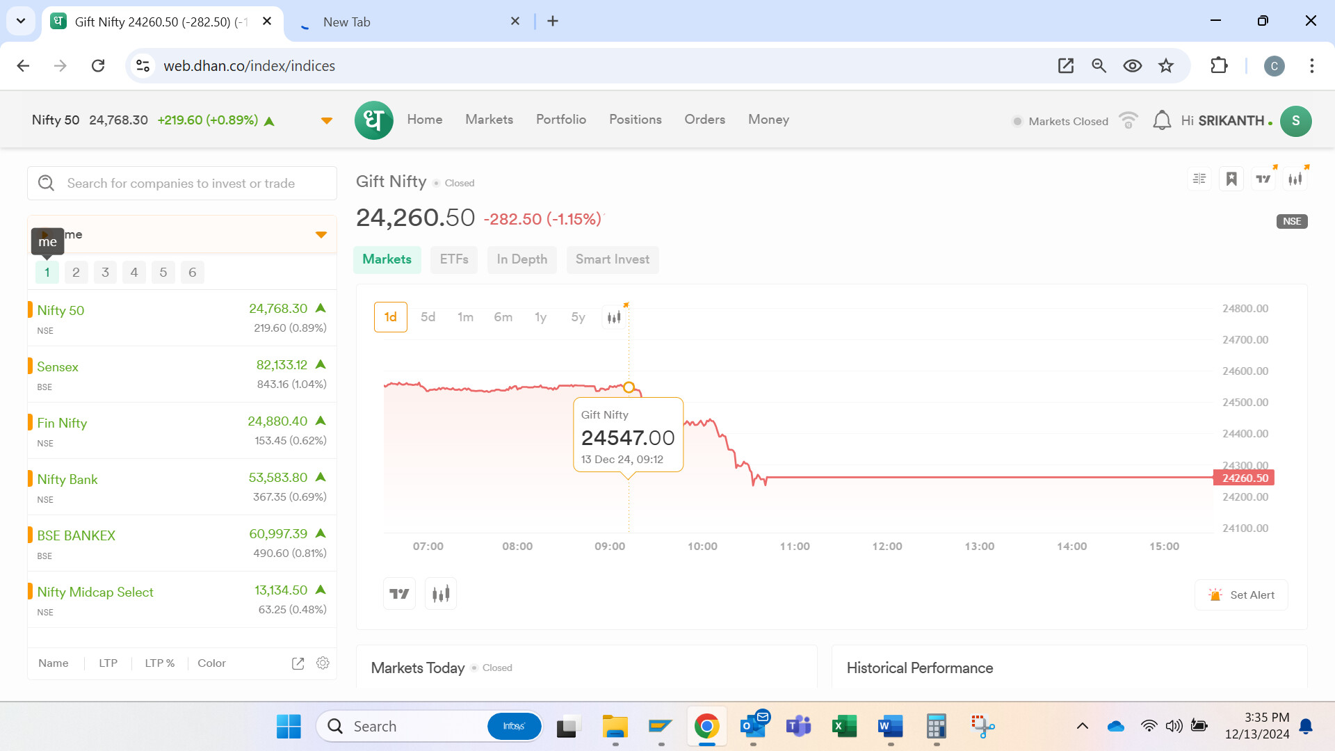 Hi @Dhan@PravinJ sir, since morning the gift nifty on dhan is not giving the real time data and it is not showing the live price data. The same has been highlighted to your team over X and after explaining in detail to your team almost after 7 hours, now your team acknowledged that there is some problem. But now I can see that over the watchlist and the home page (quick indices bar), the gift nifty price is shown wrongly whereas in charts, the live price is being shown. Kindly correct this asap as we need to wait till next market holiday to get a test case.