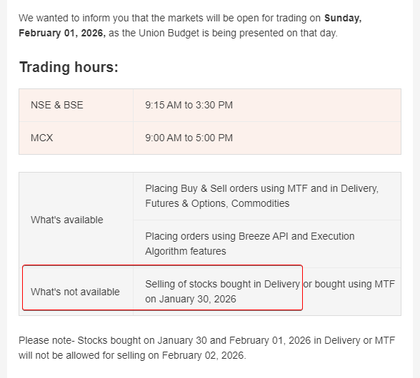 - BTST (Buy Today, Sell Tomorrow) is allowed – If you purchase stocks on Friday, 30th Jan, they will reflect in your portfolio on Sunday, 1st Feb.