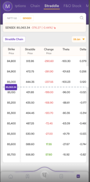 Key Straddle Information: The table features key information of the straddle and the ATM strikes such as LTP, LTP Change, OI, OI Change and Greeks.
