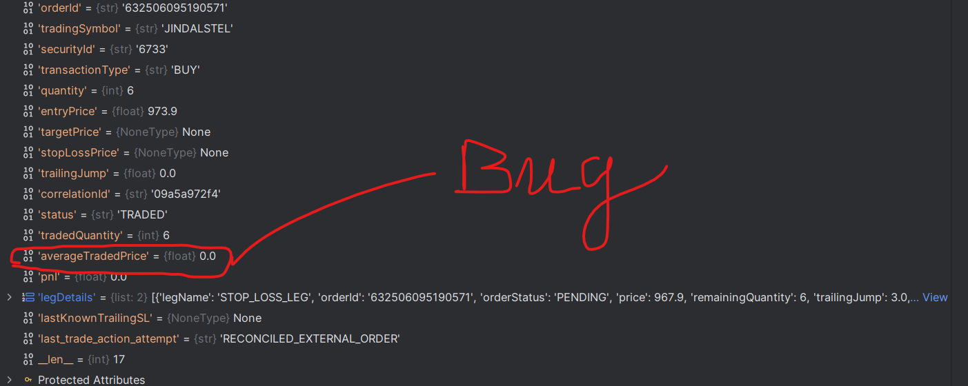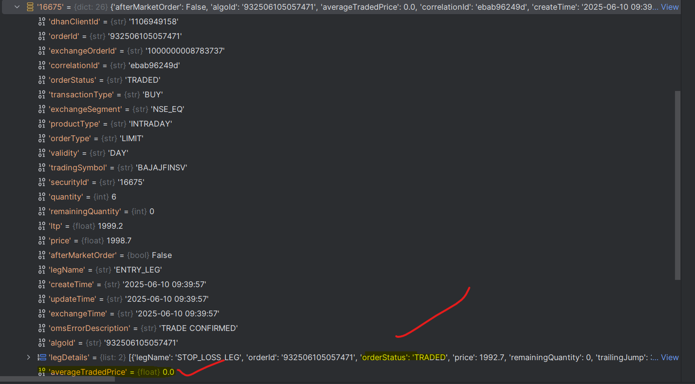 {‘afterMarketOrder’: False, ‘algoId’: ‘932506105057471’, ‘averageTradedPrice’: 0.0, ‘correlationId’: ‘ebab96249d’, ‘createTime’: ‘2025-06-10 09:39:57’, ‘dhanClientId’: ‘1106949158’, ‘exchangeOrderId’: ‘1000000008783737’, ‘exchangeSegment’: ‘NSE_EQ’, ‘exchangeTime’: ‘2025-06-10 09:39:57’, ‘filledQty’: 6, ‘legDetails’: [{‘legName’: ‘STOP_LOSS_LEG’, ‘orderId’: ‘932506105057471’, ‘orderStatus’: ‘TRADED’, ‘price’: 1992.7, ‘remainingQuantity’: 0, ‘trailingJump’: 3.0, ‘transactionType’: ‘SELL’}, {‘legName’: ‘TARGET_LEG’, ‘orderId’: ‘932506105057471’, ‘orderStatus’: ‘CANCELLED’, ‘price’: 2013.7, ‘remainingQuantity’: 0, ‘trailingJump’: 0.0, ‘transactionType’: ‘SELL’}], ‘legName’: ‘ENTRY_LEG’, ‘ltp’: 1999.2, ‘omsErrorDescription’: ‘TRADE CONFIRMED’, ‘orderId’: ‘932506105057471’, ‘orderStatus’: ‘TRADED’, ‘orderType’: ‘LIMIT’, ‘price’: 1998.7, ‘productType’: ‘INTRADAY’, ‘quantity’: 6, ‘remainingQuantity’: 0, ‘securityId’: ‘16675’, ‘tradingSymbol’: ‘BAJAJFINSV’, ‘transactionType’: ‘BUY’, ‘updateTime’: ‘2025-06-10 09:39:57’, ‘validity’: ‘DAY’}