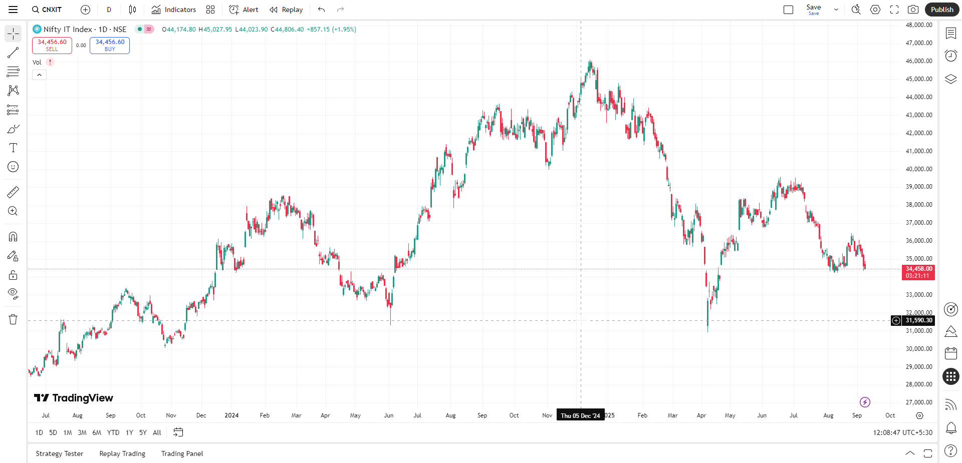 Adding to the concerns, many IT stocks have already seen sharp declines from their 52-week highs, reflecting investor unease amid global policy shifts and economic challenges. For example, Tech Mahindra trades about 18.24% below its 52-week high of ₹1,807.40, closing near ₹1,477 as of September 5, 2025, while other majors like TCS and Infosys have also faced pullbacks. The Nifty IT index has been hit by disappointing Q1 revenues and fears of reduced outsourcing demand, further eroding confidence. With these headwinds, the IT sector risks acting as a drag on the Nifty50, potentially limiting its upward trajectory unless positive developments, such as new contracts or relaxed U.S. policies, emerge to restore momentum.