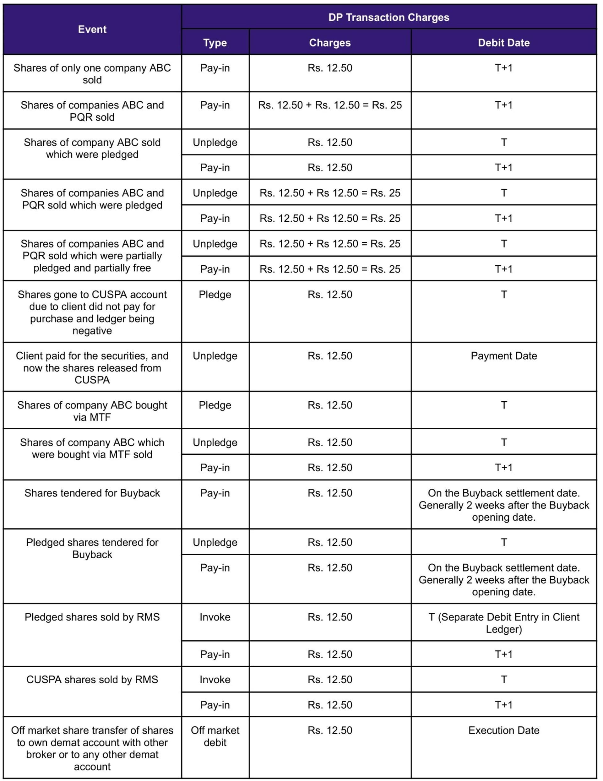 As your DP/Broker, we perform various transactions as per your instructions and these transactions are chargeable as per tariff sheet. Some common types of transactions include the Pay-out and Pay-in of securities when you buy and sell, pledge, unpledge, invoke, dematerialization, rematerialization, and off-market transfer of securities.