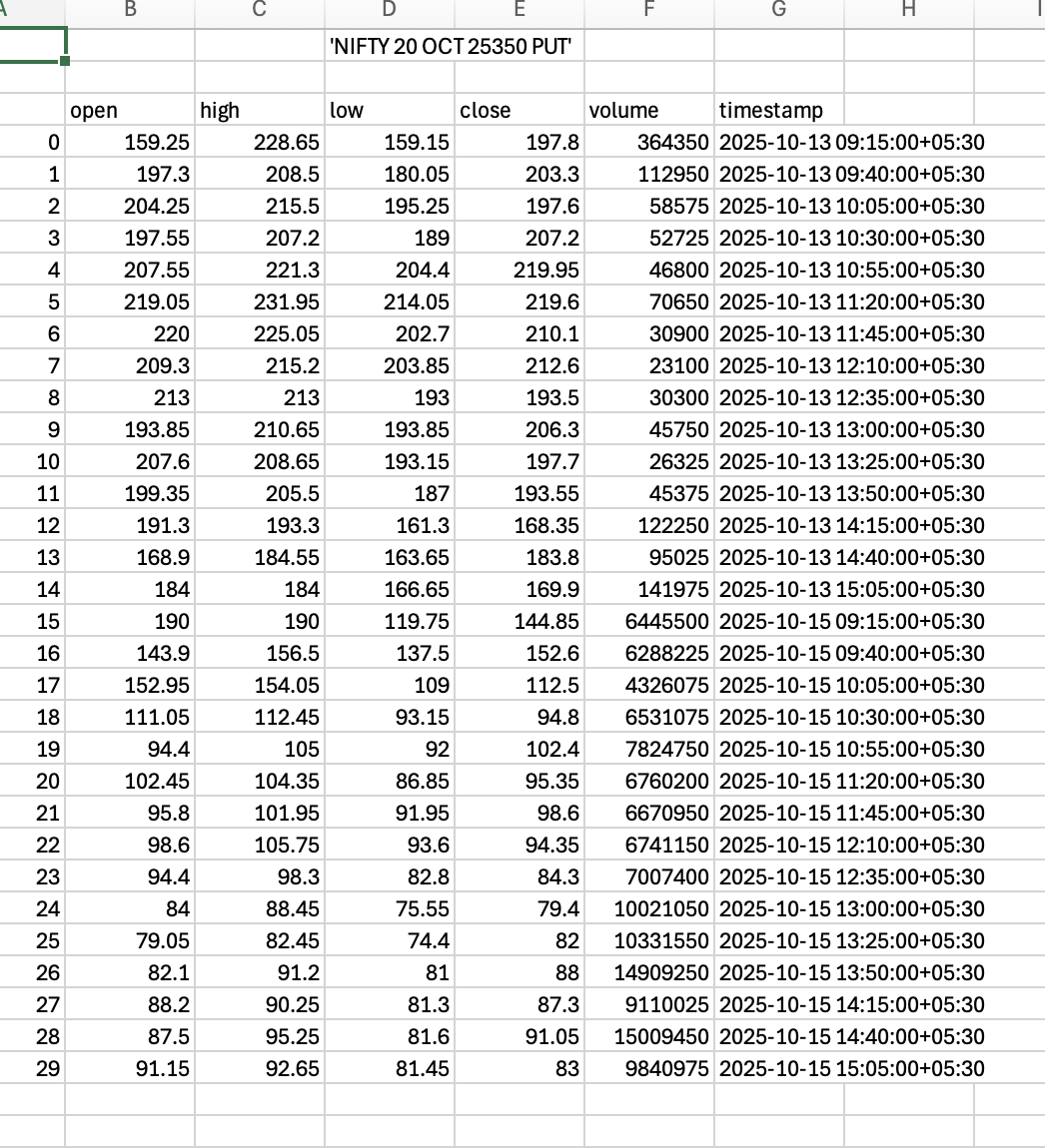 Hi @Tradehull_Imran I found an issue while fetching the 25-minute timeframe historical data. Please refer to the screenshots — it’s clearly visible that today, on 15-Oct-2025, the data shows 13-Oct-2025 and 15-Oct-2025, but the previous day’s data (14-Oct-2025) is missing.
