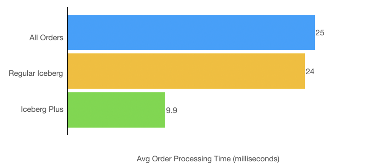 When comparing execution time, Iceberg Plus stands out significantly. The speed to execute an Iceberg Plus order is around 60% faster than regular Iceberg orders, and much faster when compared to the already faster standard order types. This means users who choose Iceberg Plus are not only benefiting from slicing but also getting faster executions, crucial in volatile markets.