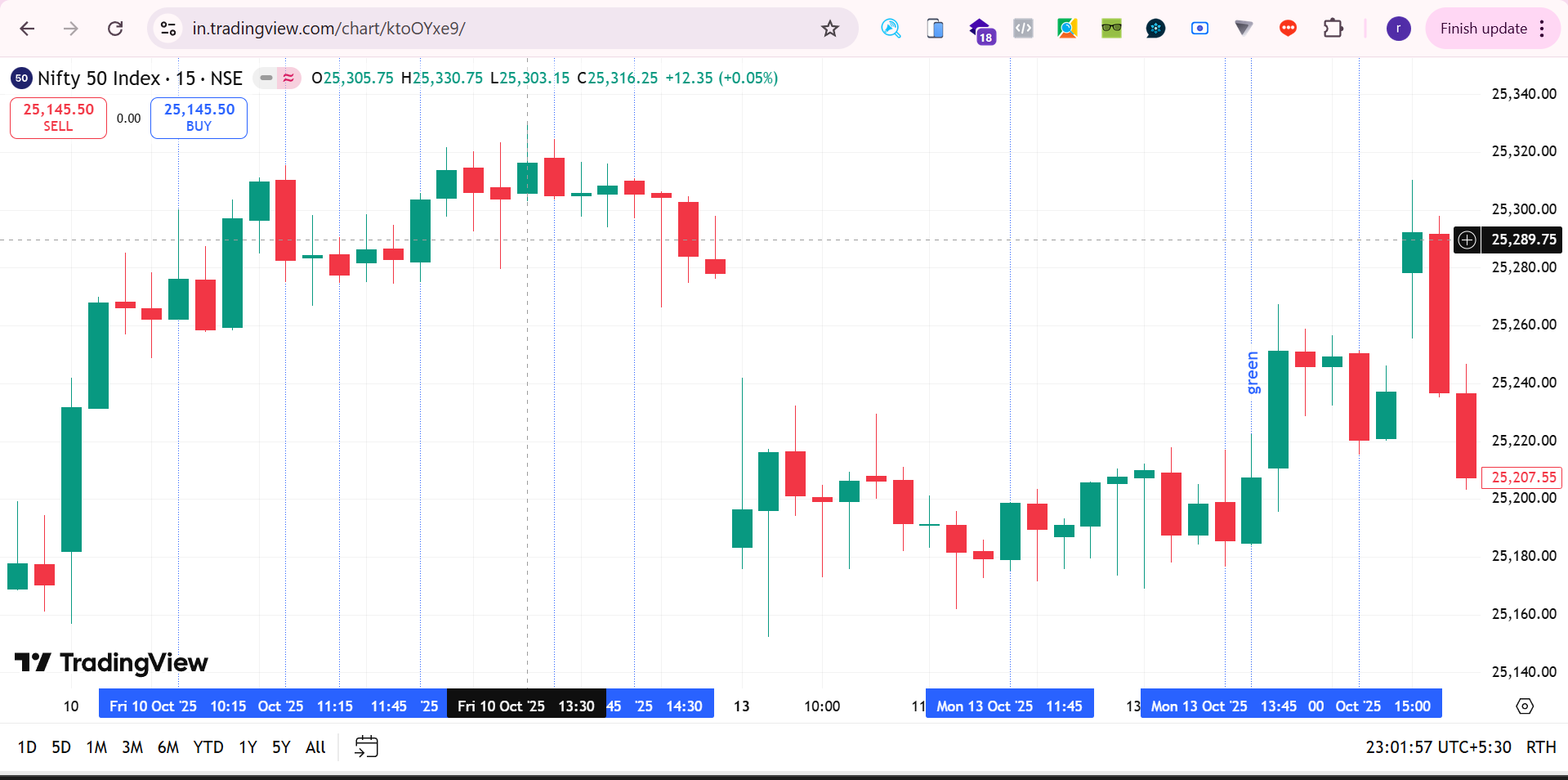 | 2025-10-10 13:45:00 | 25318.05 | 25324.60 | 25303.50 | 25304.95 | 0 | 64.74 | -100 |