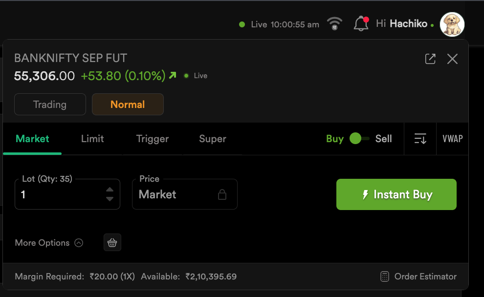 Hey @hachiko, since you’ve got an open short sell position in BANKNIFTY SEP FUT, the order window is considering it as an square-off position. That’s why the margin is just ₹20 i.e for (brokerage).