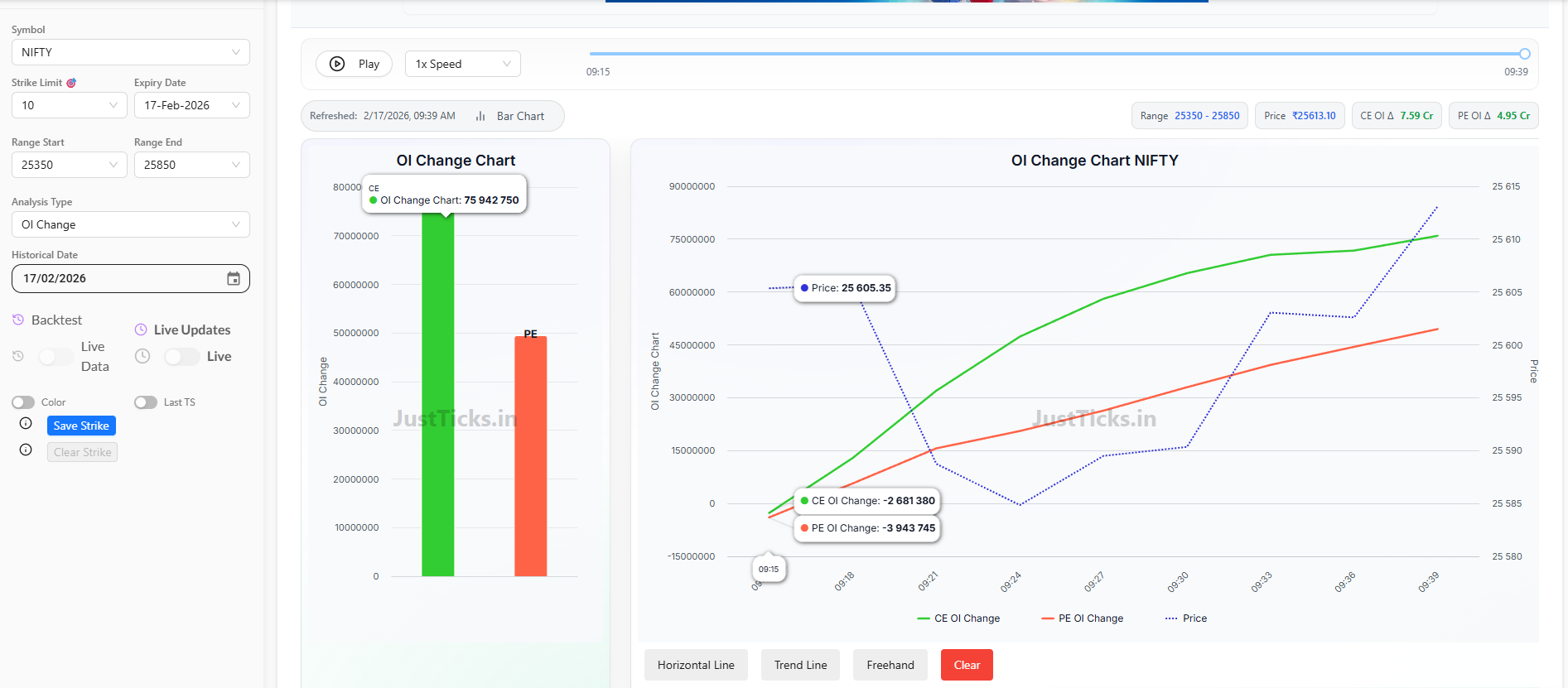 Live OI Change Tracking: A line chart showing how CE and PE open interest is trending minute-by-minute.