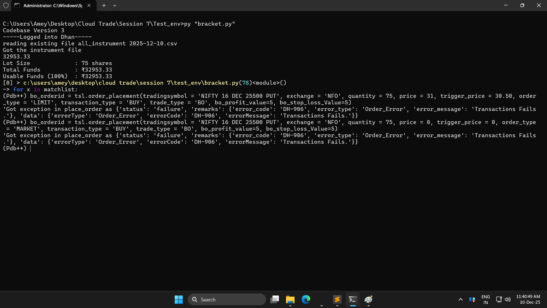 pe_name:NIFTY 02 DEC 26100 PUT| strike:26100 PE Entry Price:43.4 BO Profit Value :43.85 BO StopLoss Value :41.25------------------------------------'Got exception in place_order as {‘status’: ‘failure’, ‘remarks’: {‘error_code’: ‘DH-906’, ‘error_type’: ‘Order_Error’, ‘error_message’: ‘Transactions Fails.’}, ‘data’: {‘errorType’: ‘Order_Error’, ‘errorCode’: ‘DH-906’, ‘errorMessage’: ‘Transactions Fails.’}}