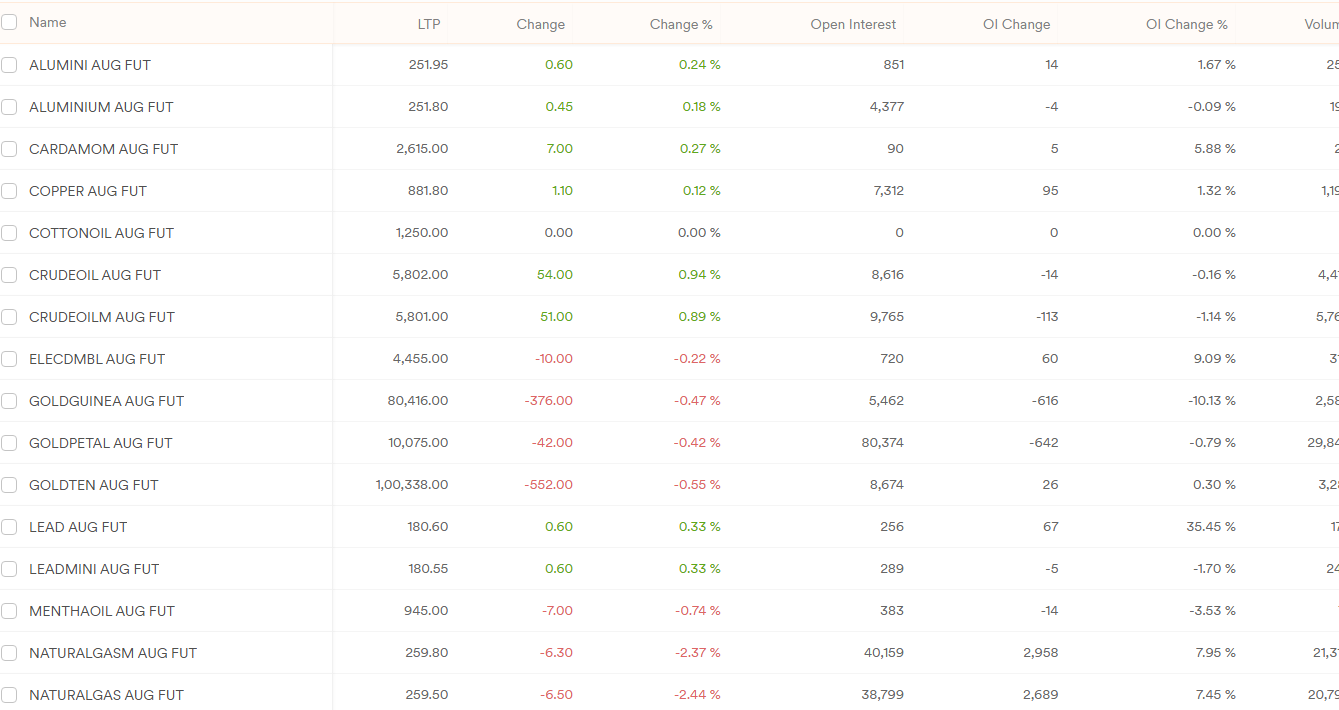 Now, this has created a unique problem. Let’s say, I am seeing Aug 25 futures for commodities but GoldM is due to expire today. So, Aug 25 futures will show it when there is no point in trading in them. See the circle, there is no OI in those scrips.