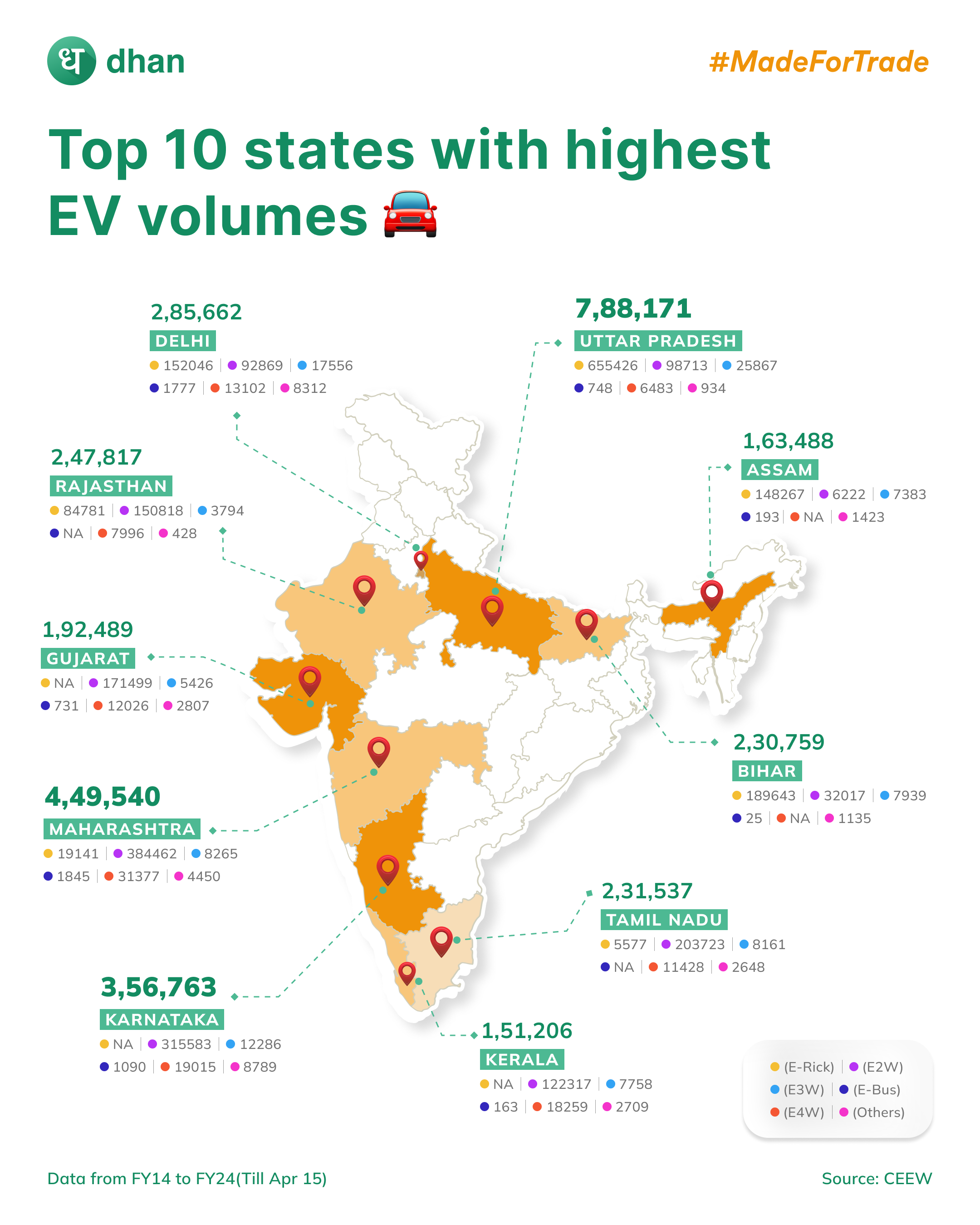 Uttar Pradesh leads the charge with 788,171 units, followed by Maharashtra with 449,540 units. Karnataka, Delhi, and Rajasthan also showcase significant EV presence, with numbers ranging from 356,763 to 247,817. Tamil Nadu, Bihar, Gujarat, Assam, and Kerala contribute substantially to the green mobility landscape, with each state boasting EV counts ranging from 231,537 to 151,206.