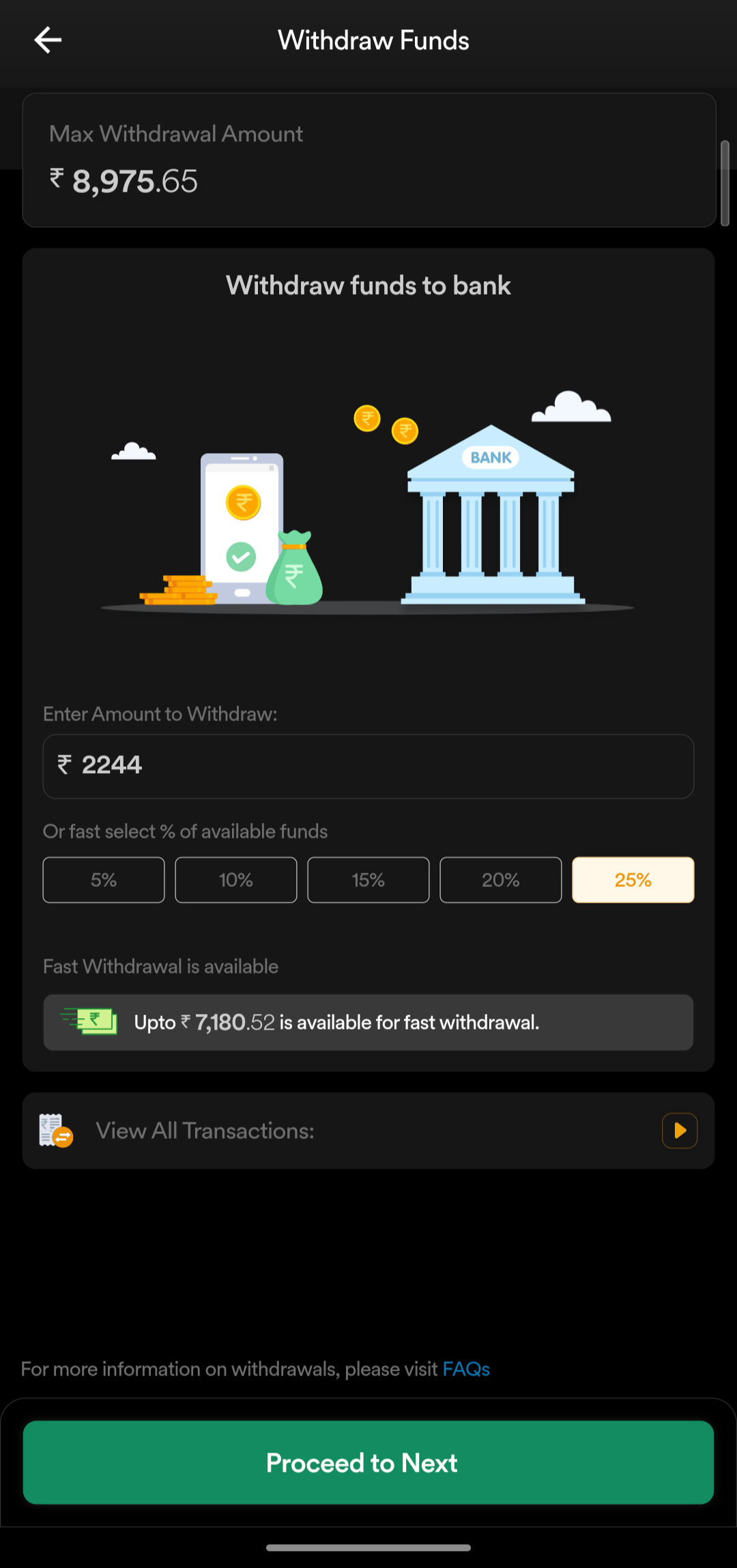 As you can see in my account, ₹7180 is available for fast withdrawal i.e. thru IMPS. So any amount below 7180 will be processed within 10 mins usually (in my case).