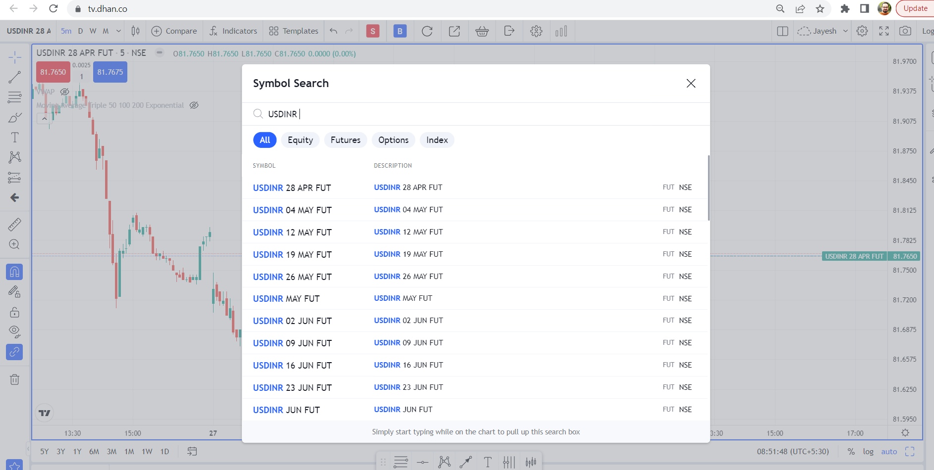 I’m new to the platform, I’ve tried searching the following but unable to find please guide me how to view USDINR technical chart in tv.dhan.co also the same in dhan/ options trader and trading view android app.