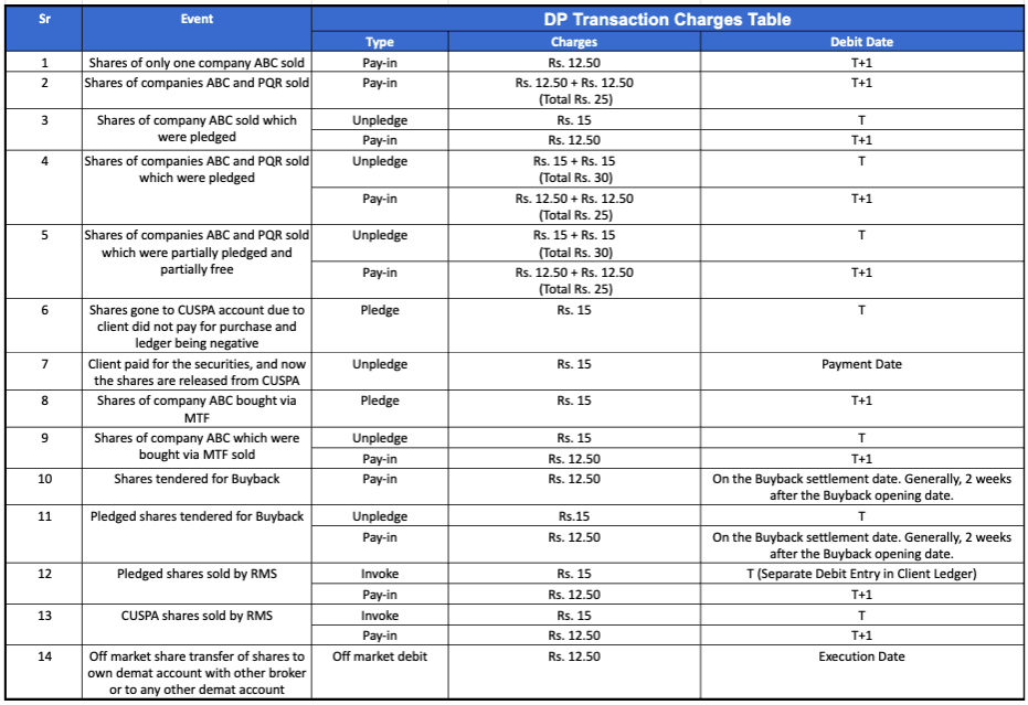 As your DP/Broker, we perform various transactions as per your instructions and these transactions are chargeable as per tariff sheet . Some common types of transactions include the Pay-out and Pay-in of securities when you buy and sell, pledge, un-pledge, invoke, dematerialization, re-materialization, and off-market transfer of securities.