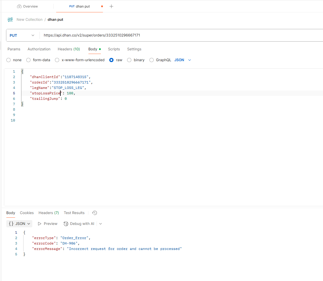 I am tring to update the super order (trying to update the stop-loss value) but getting below error “{