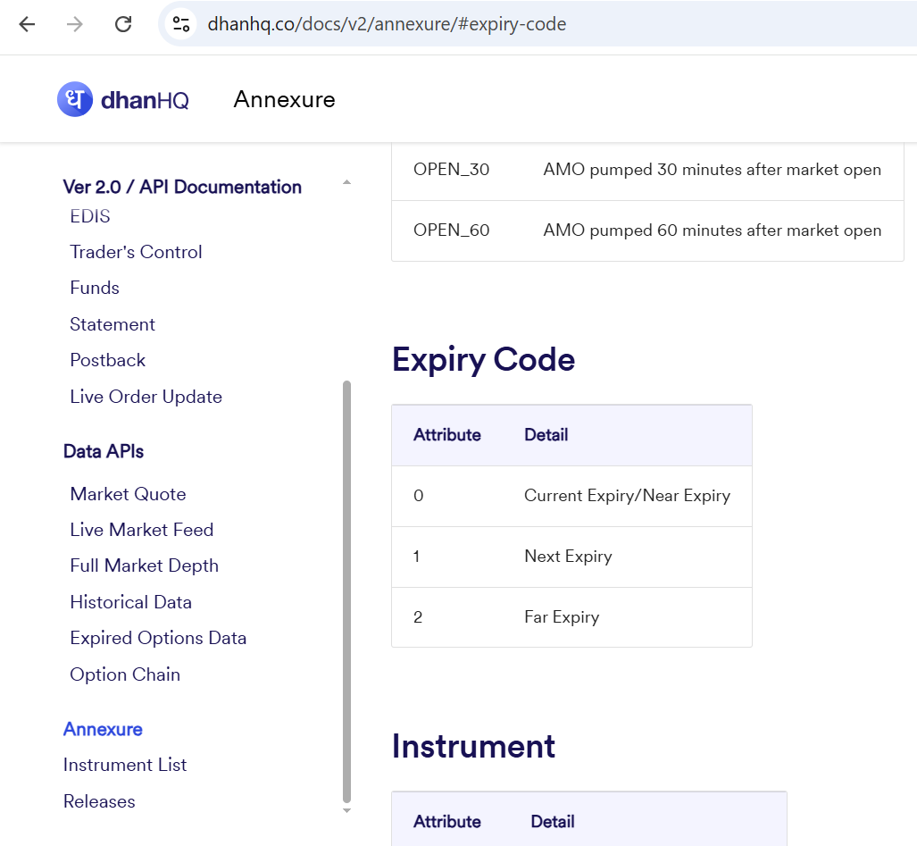 For all other API calls, please refer to the annexure for the applicable expiry codes Annexure - DhanHQ Ver 2.0 / API Document