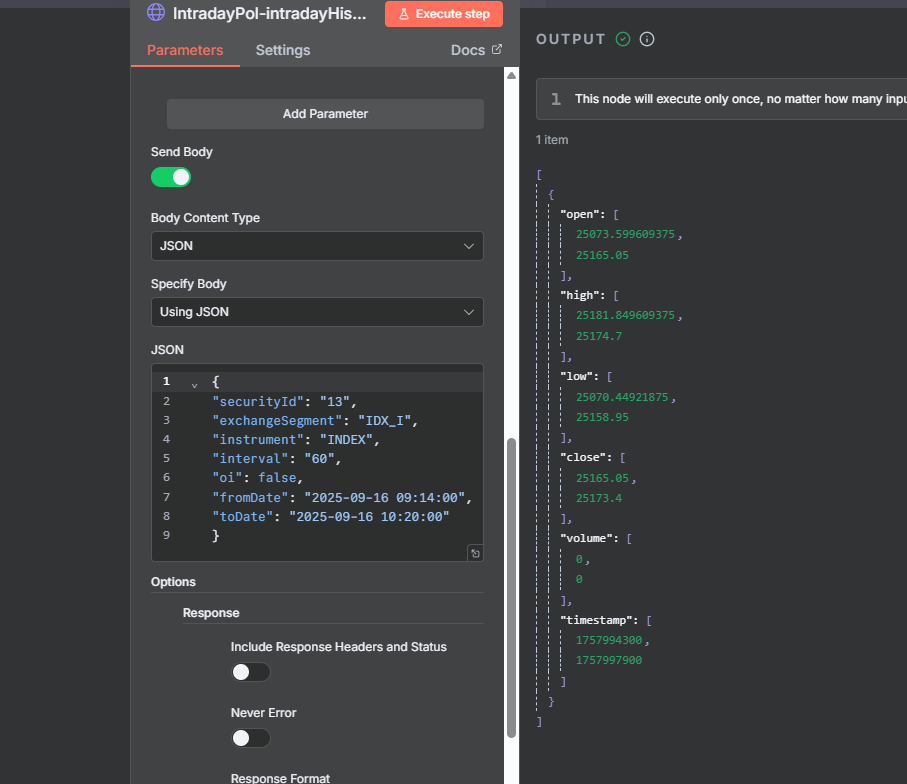 As we can see, the data is being fetched for index, and since indices are non-tradable, their volume is shown as 0. You may verify this by checking other tradable segments such as equity, futures, or options.
